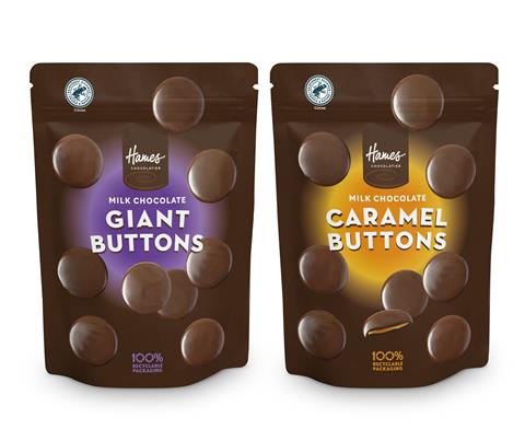 Lincolnshire-based British chocolatier, Hames, is expanding its confectionery portfolio with the launch of its new Giant Buttons range - in Milk Chocolate and Milk Chocolate Caramel 100g resealable stand-up pouches.